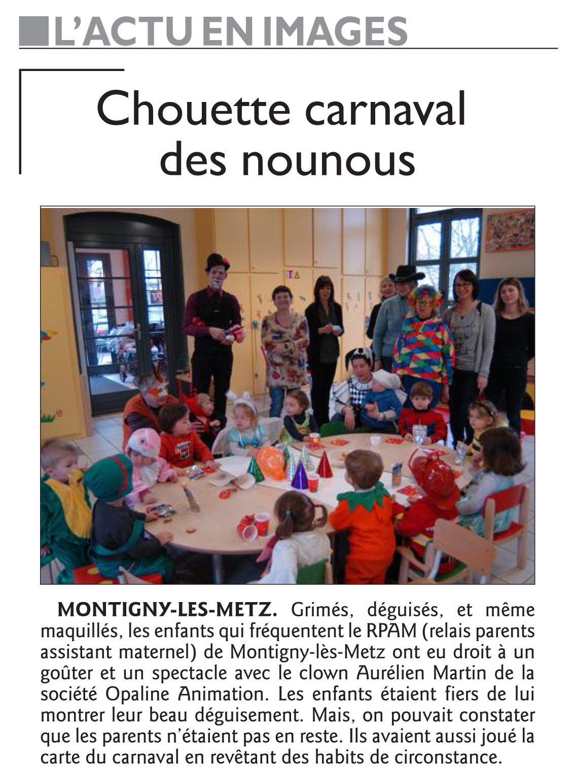Grimés, déguisés, et même maquillés, les enfants qui fréquentent le RPAM (relais parents assistant maternel) de Montigny-lès-Metz ont eu droit à un goûter et un spectacle avec le clown Aurélien Martin de la société Opaline Animation. Les enfants étaient fiers de lui montrer leur beau déguisement. Mais, on pouvait constater que les parents n’étaient pas en reste. Ils avaient aussi joué la carte de carnaval en revêtant des habits de circonstance.