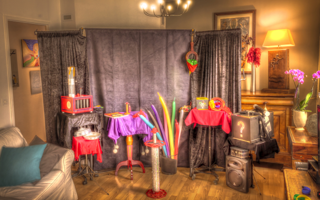 Ce jour là je suivis Dom sur son spectacle, un samedi dans les années 2004. Dans la cuisine aménagée en loge, quelques paillettes sur le bout du nez, deux points rouges sur les paumettes…. en voiture Simone! Le spectacle commence devant un jeune public conquis. Les années passent et les représentations usent quelques ustensiles… parfait ! Le spectacle n’en sera que meilleur !